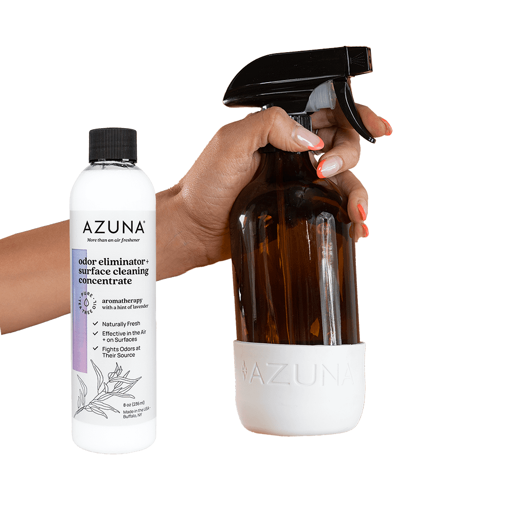 Our highly-rated surface cleaning concentrate packs a punch. Just one eight-ounce bottle creates 32 ounces of cleaning spray, while the amber glass bottle preserves its potency. Perfect for tackling odors on soft surfaces (upholstery, curtains, and area rugs) and dust or pet dander on hard surfaces (coffee tables, windowsills, and TV consoles), all you need to do is spray and wipe with a microfiber cloth. And, when used as directed, it’s completely safe around children and pets. So that well-loved dog bed in the corner? You can Azuna that, too.
